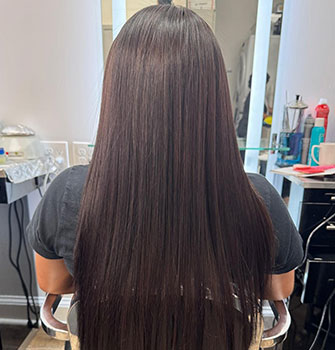 This smoothing treatment tames frizz and reduces bulk for a polished, sleek look. Your hair feels smoother, styles faster, and holds shape longer.